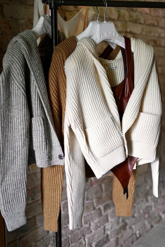 FUMIKA_UCHIDA / SHETLAND RIB STITCH HOODED CARDIGAN (IVORY , TOP BROWN , TOP GREY)