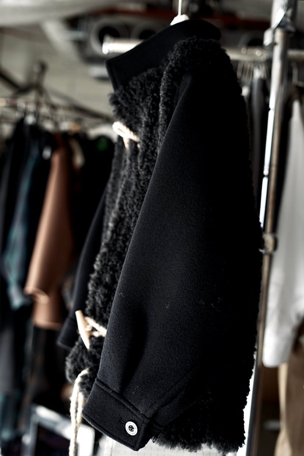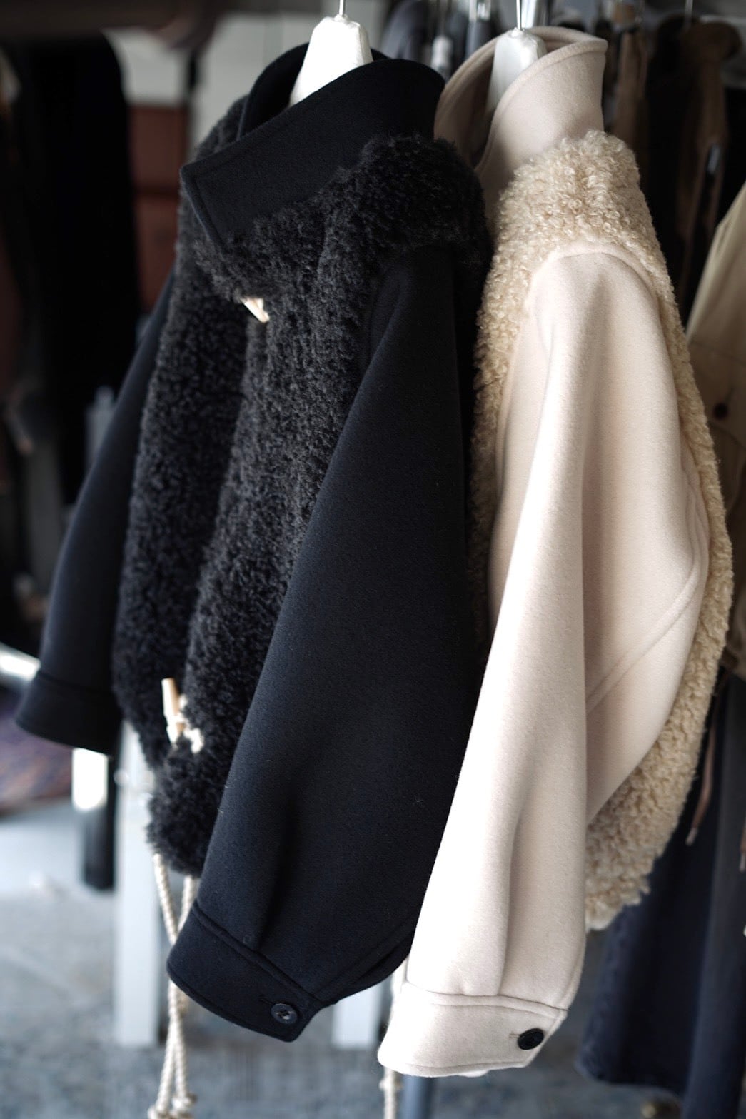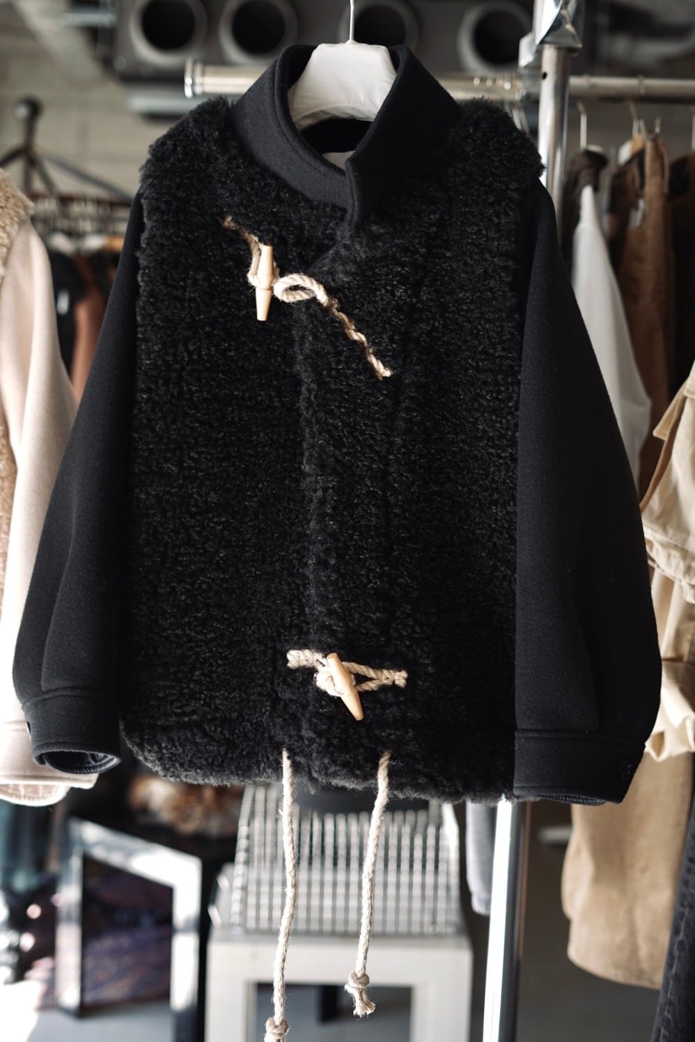 HYKE / DOUBLE FACE FAUX SHEARLING DUFFEL JACKET ( BLACK , CREAM )