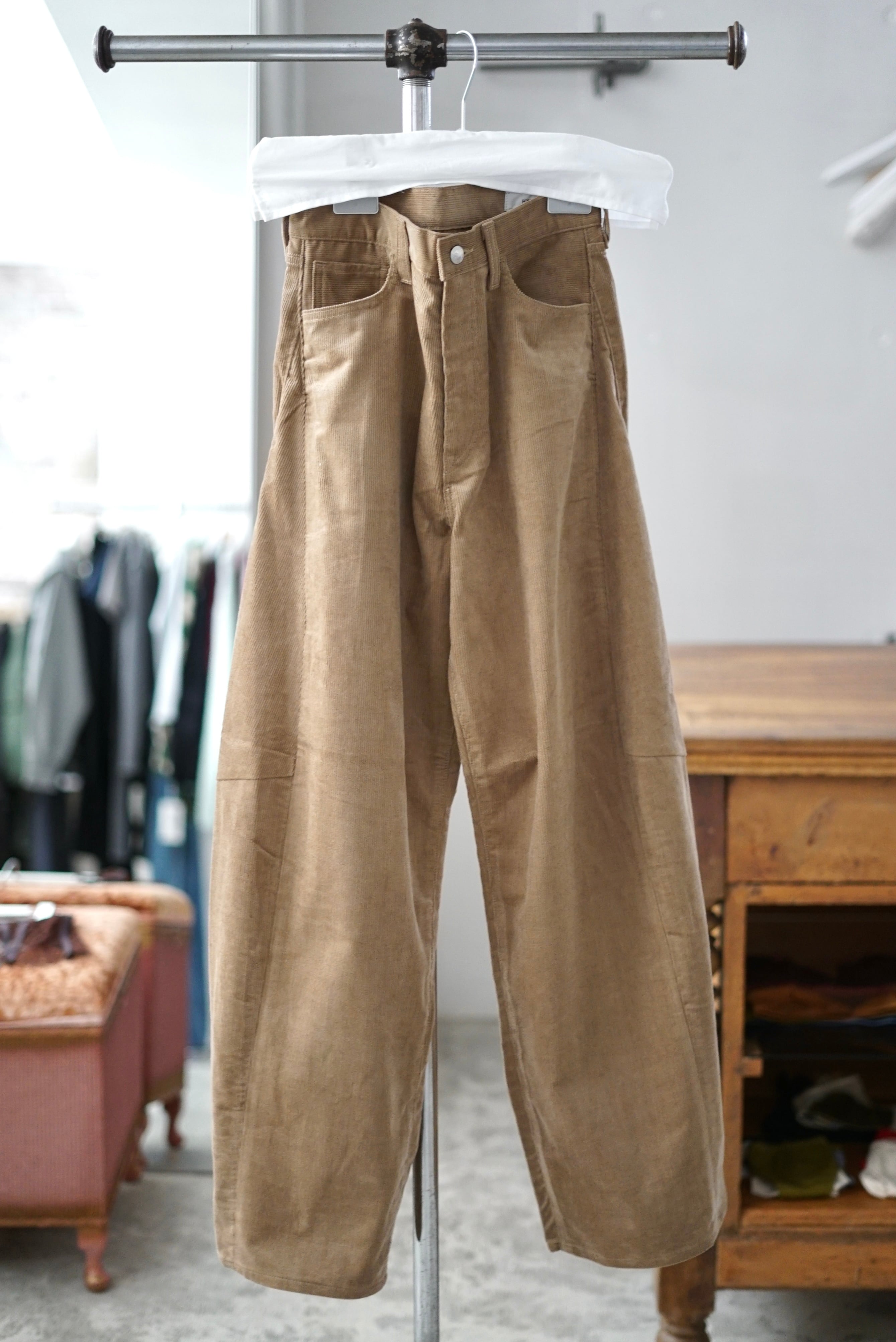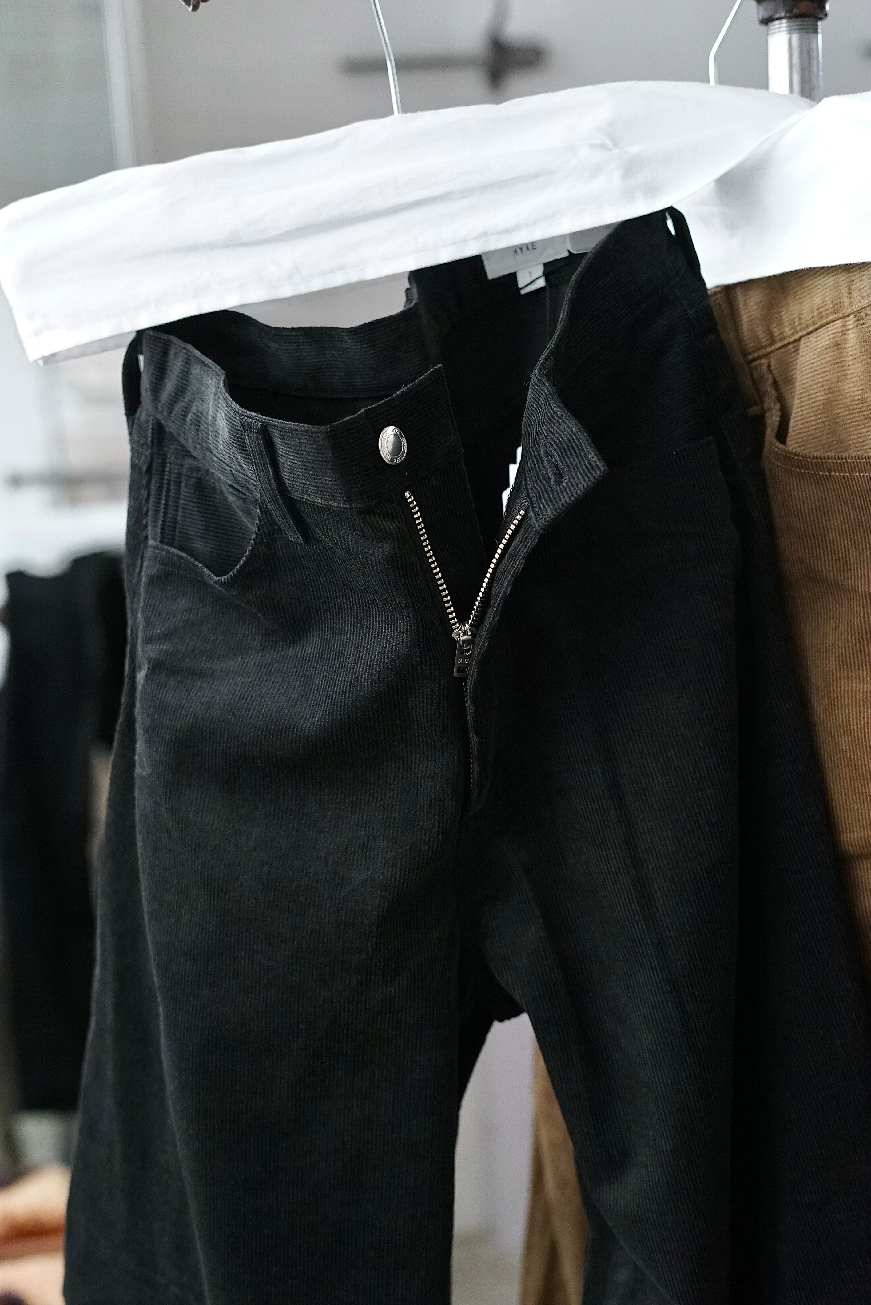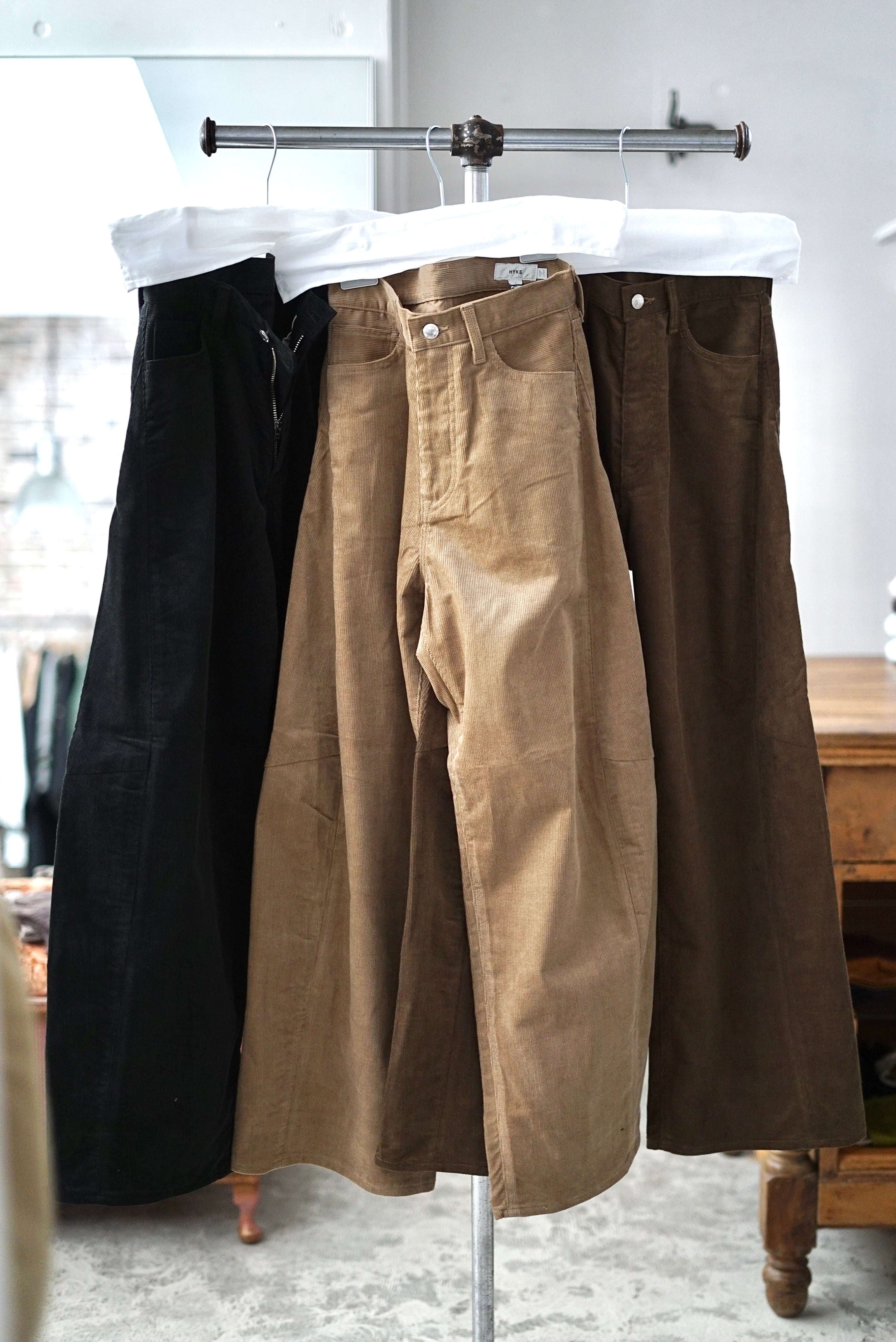 HYKE / CORDUROY BARREL-LEG JEANS (BLACK, BEIGE, COYOTE BROWN)