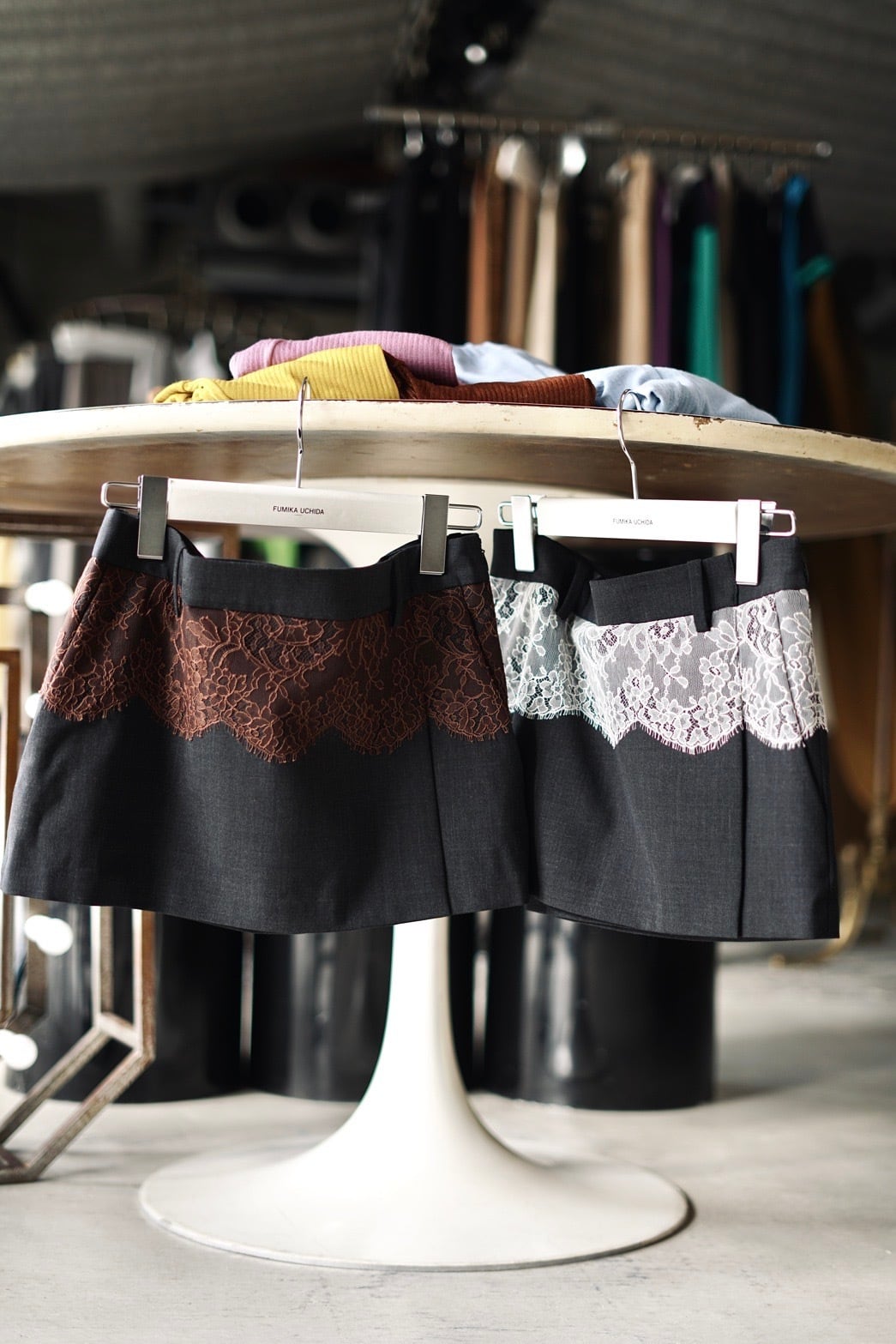 FUMIKA_UCHIDA / SUITING LACE WAIST MINI SKIRT (CHARCOAL/WHITE , CHARCOAL/BROWN)