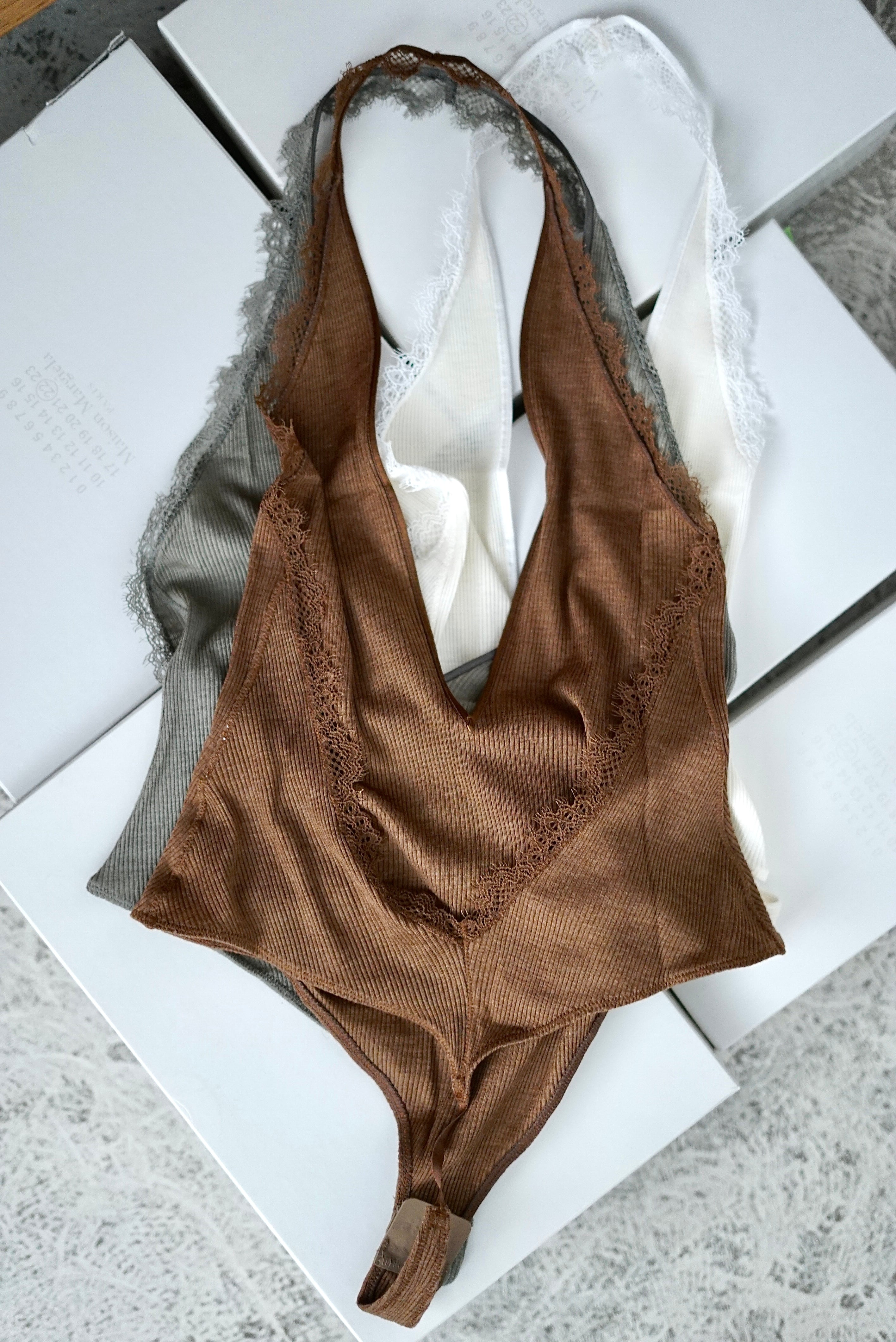FUMIKA_UCHIDA / RIB HALTER-NECK BODYSUIT ( KINARI , SAGE , BROWN )