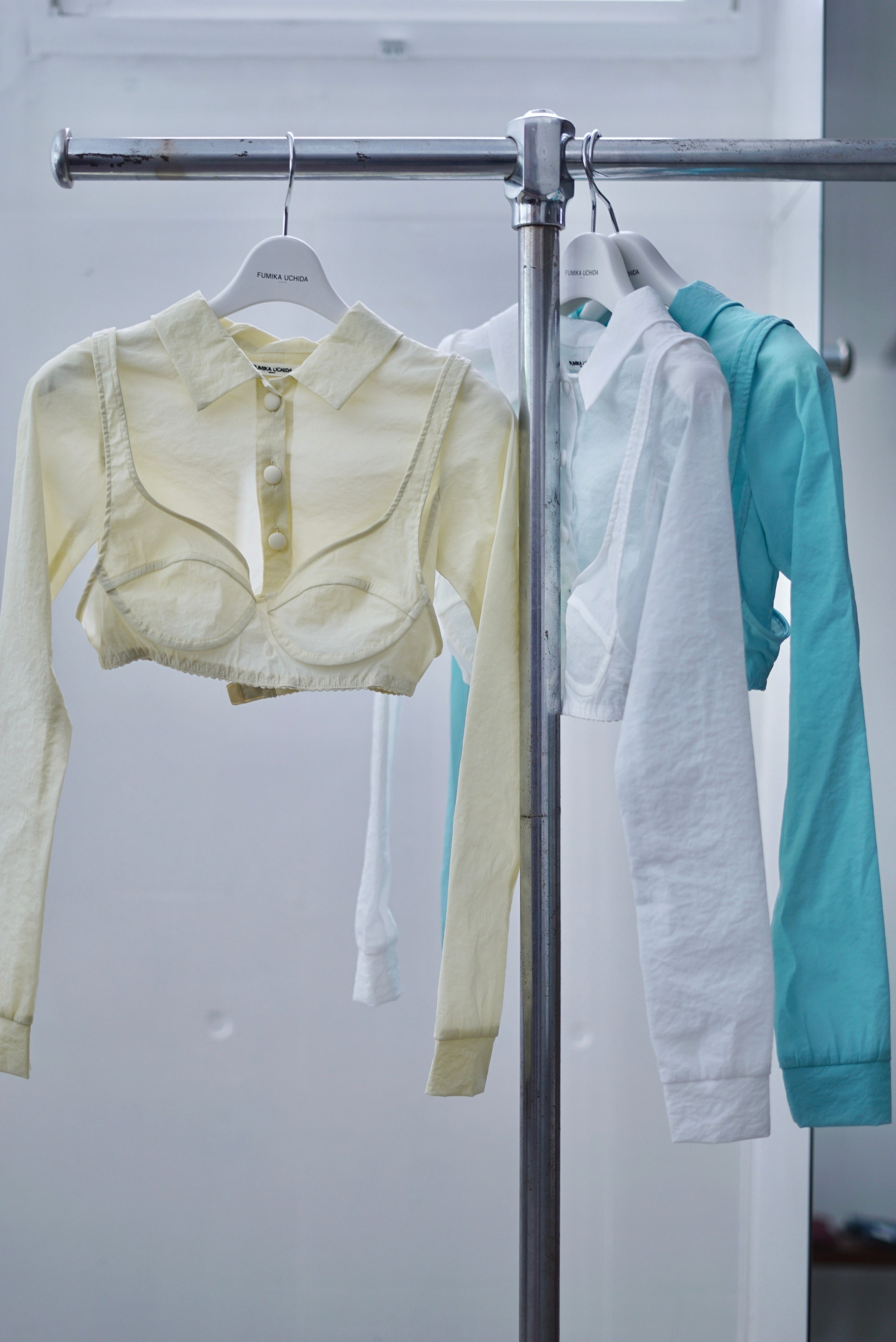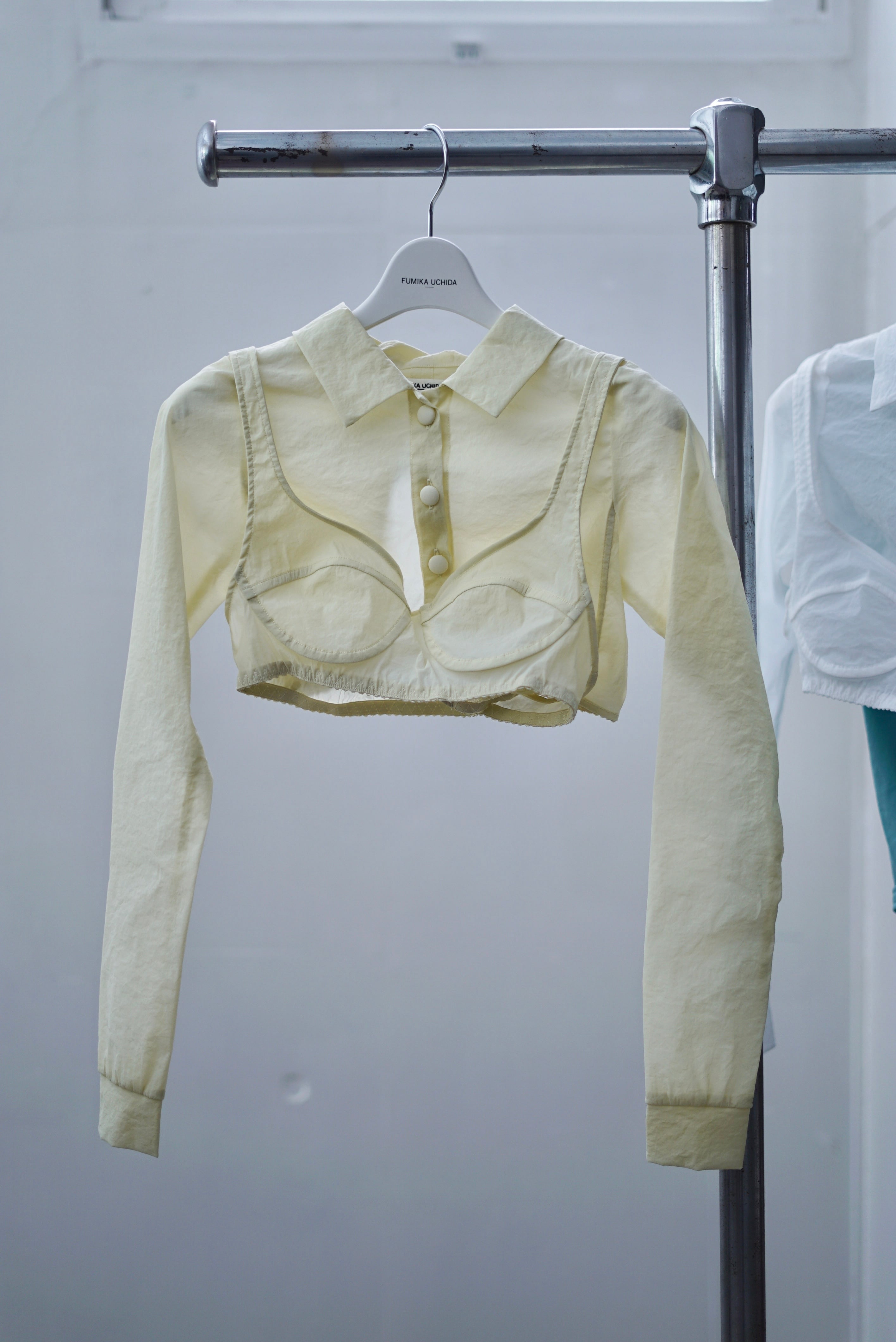 FUMIKA_UCHIDA / STRETCH TAFFETA LAYERED BRA TOP SHIRT (WHITE, EGG, PALE AQUA)