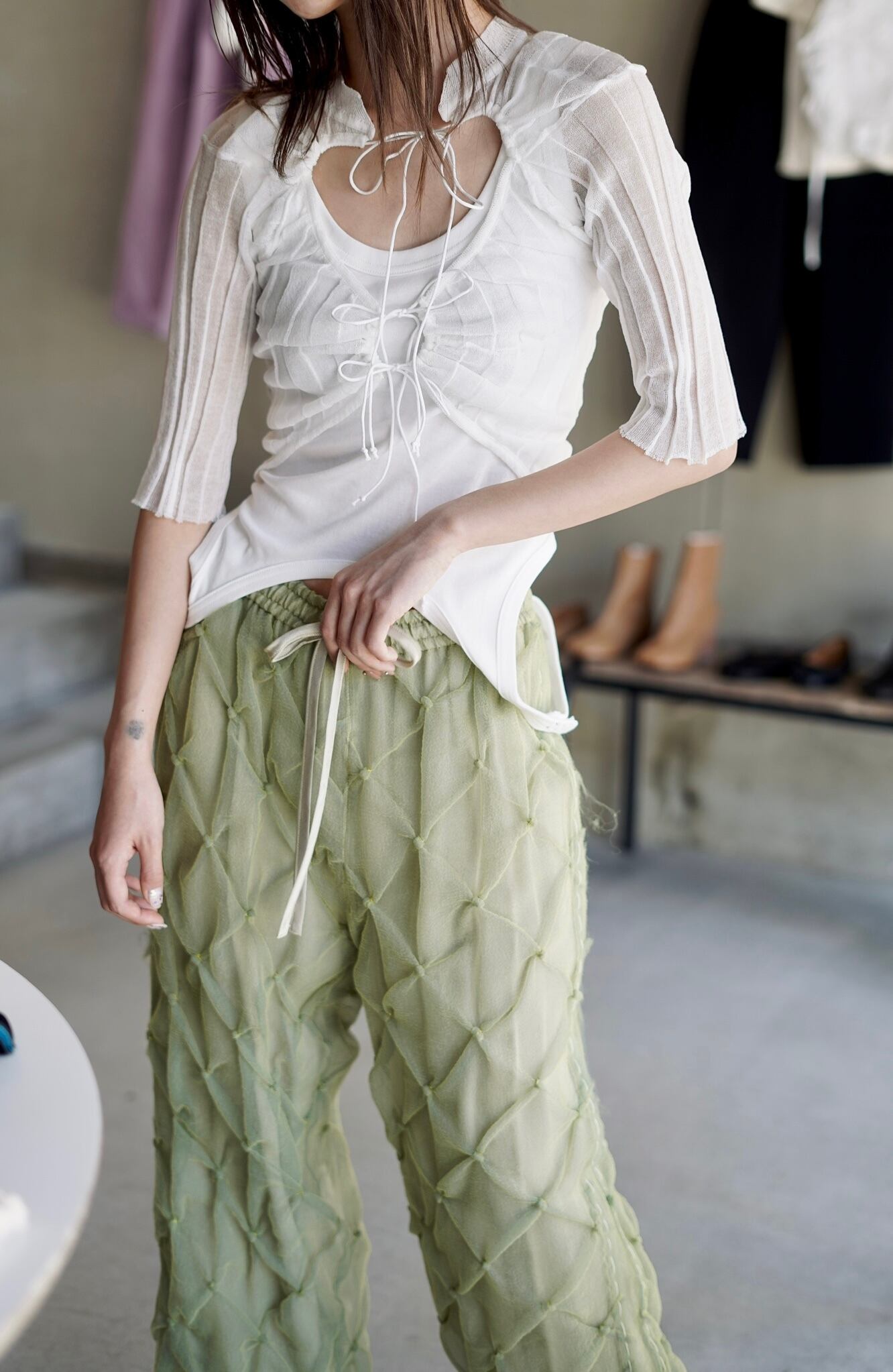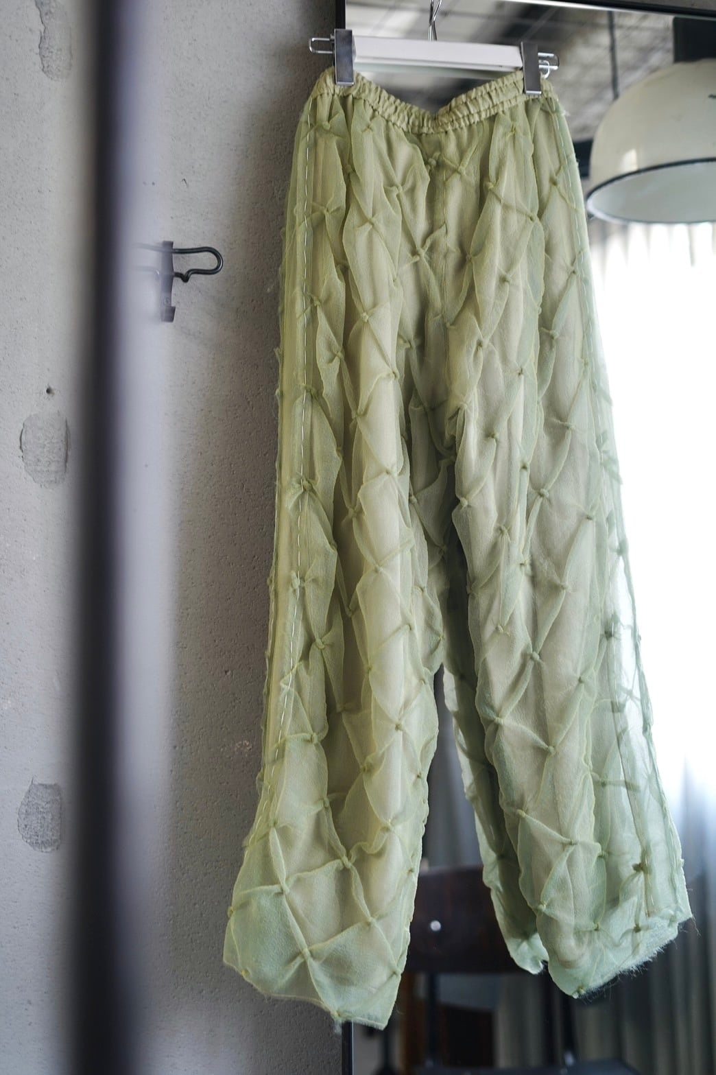 FUMIKA_UCHIDA / Nylon Organdie・Satin/ EMBROIDERED TRACK PANTS (SULFUR×CEMENT / AVOCADO satin)