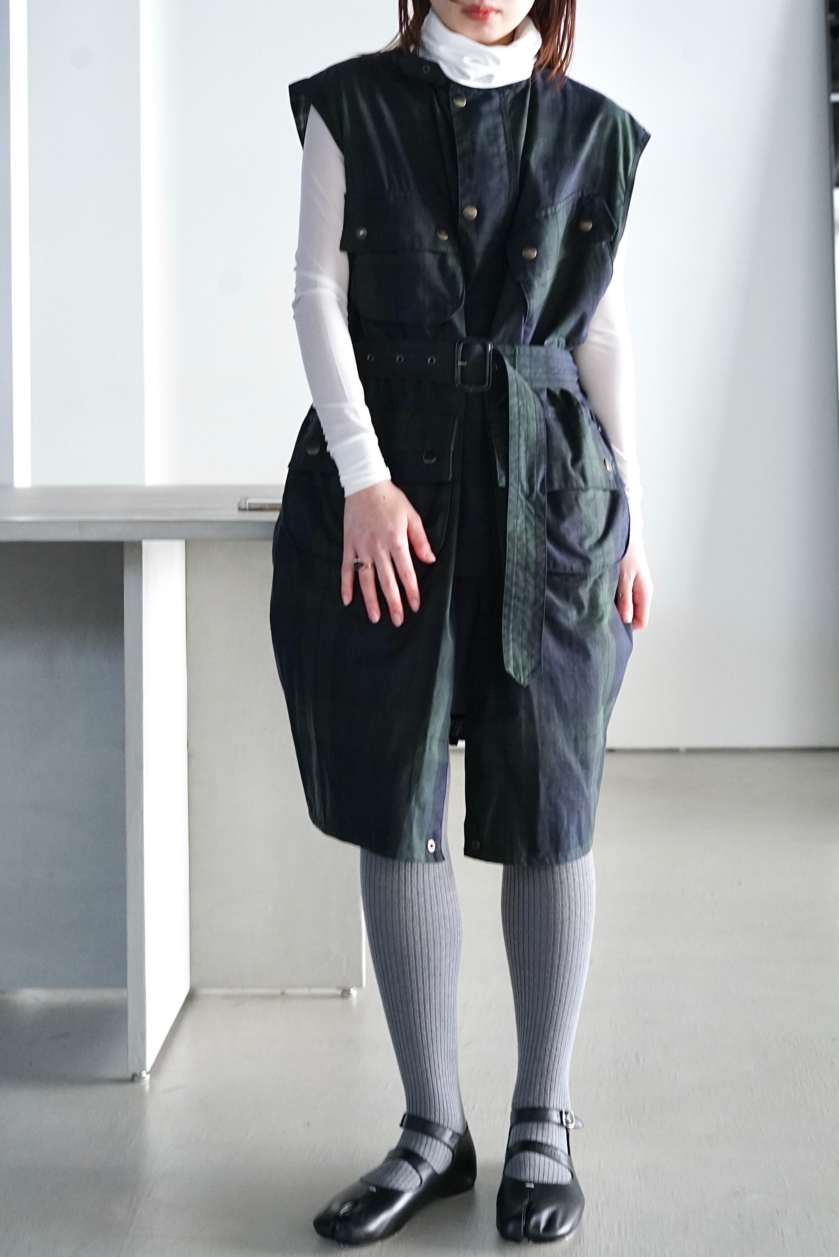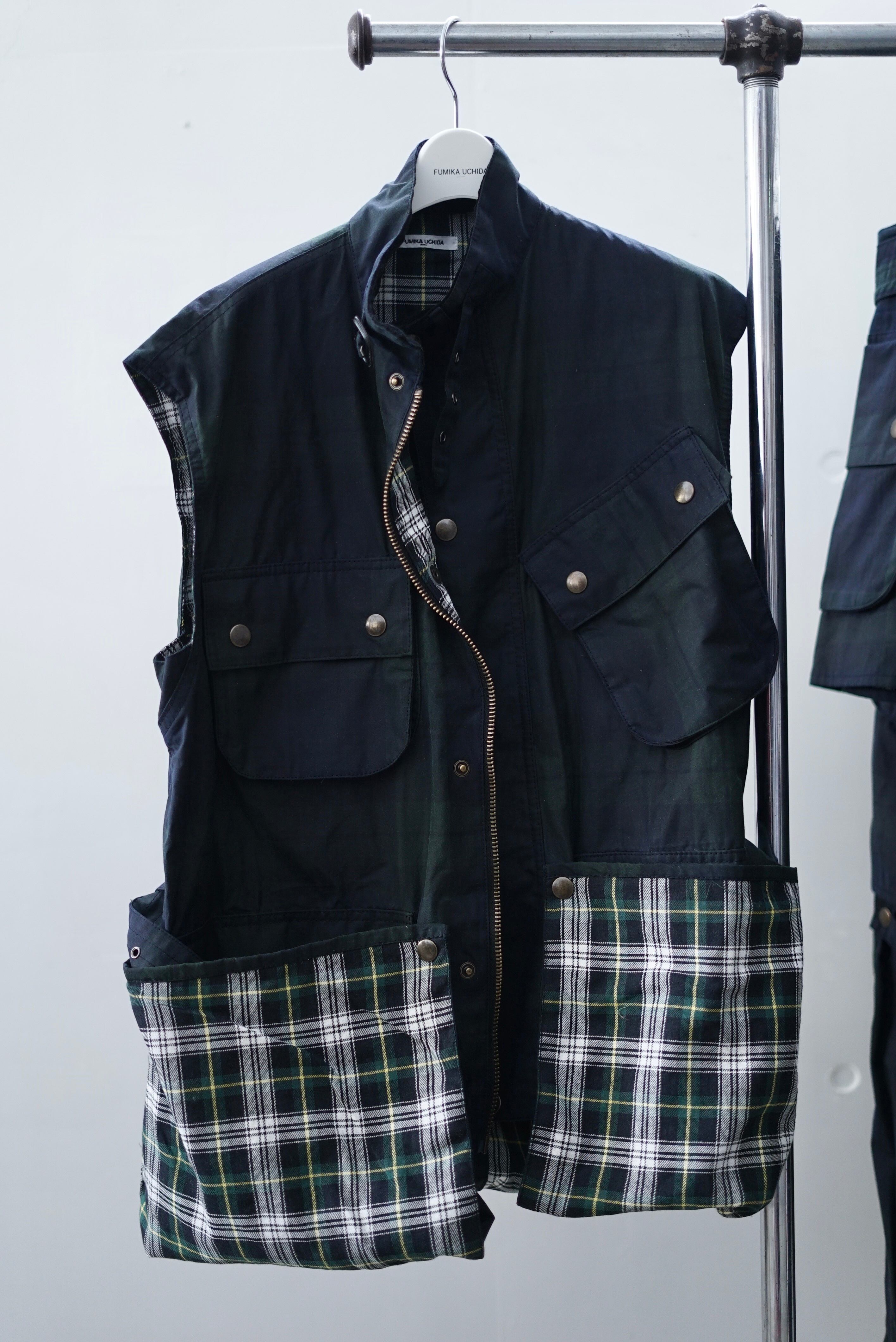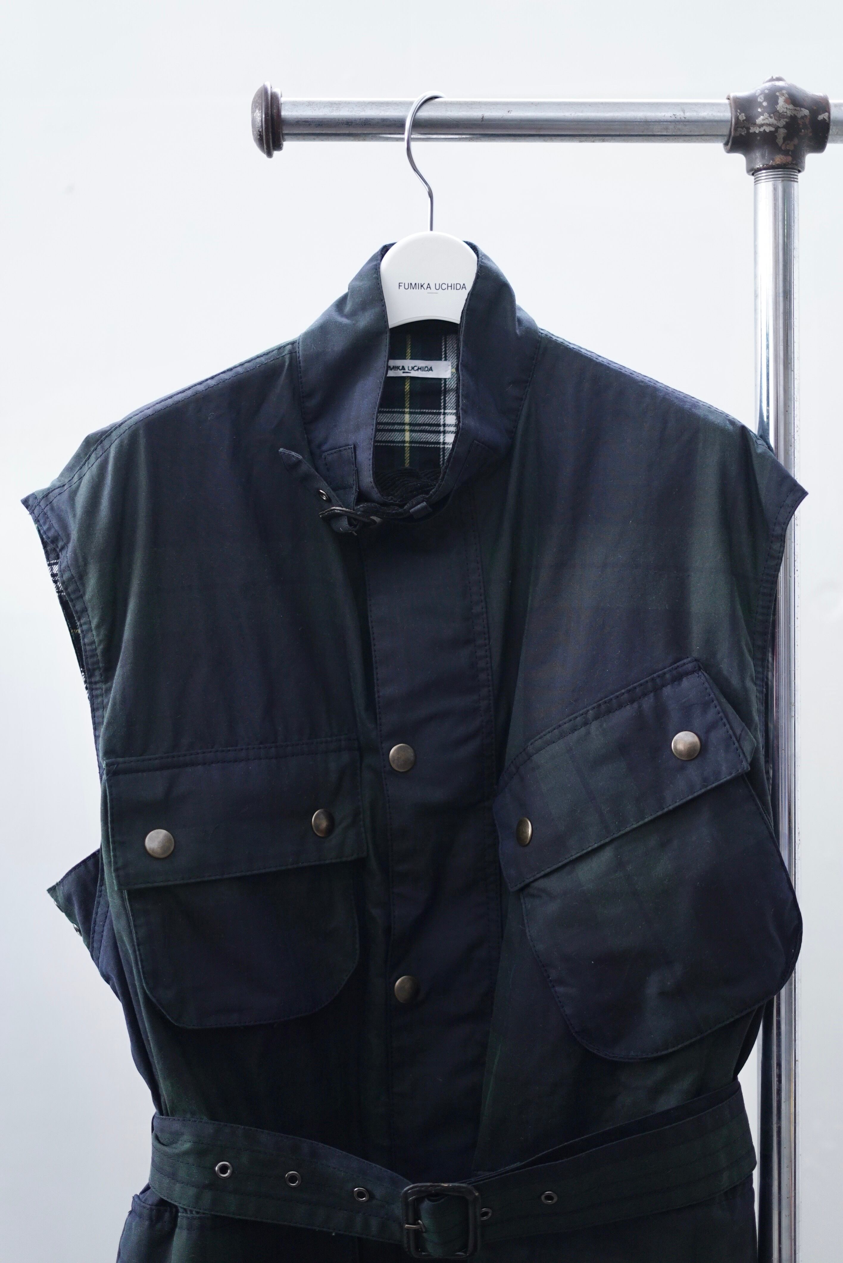 FUMIKA_UCHIDA / OILED TARTAN PLAID SLEEVELESS HUNTER COAT (DARK NAVY)