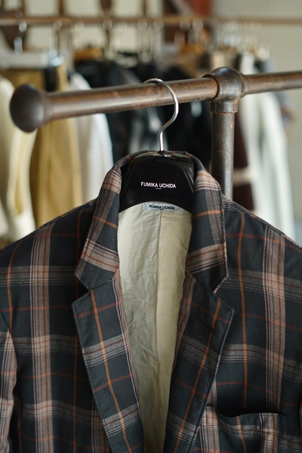 FUMIKA_UCHIDA / PLAID NOTCHED LAPEL SINGLE JACKET (D.GREEN PLAID / BORDEAUX PLAID)